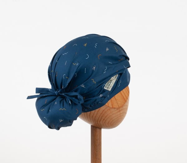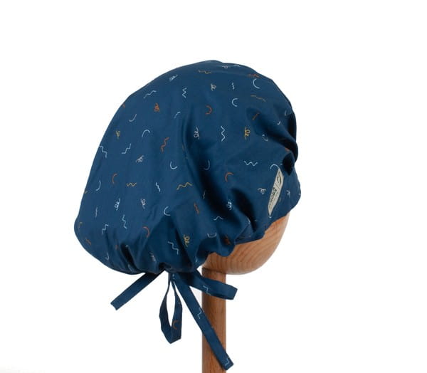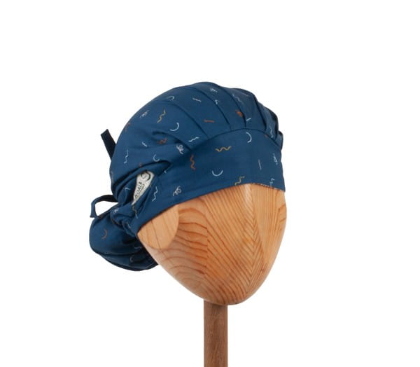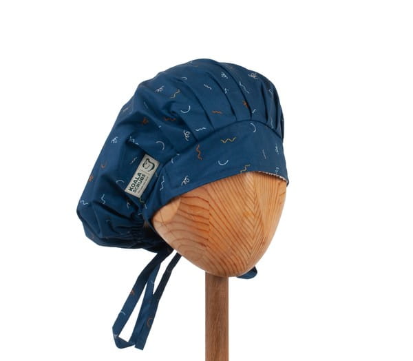 czepek KOALA w kolorowe kreski na granatowym tle. Czepek powstał by sprostać podstawowemu wymogowi BHP - całkowita ochrona włosów - umożliwia ubranie w formie luźnej oraz upiętej (patrz zdjęcia) - tył wykończony gumką - posiada dodatkowe, boczne tasiemki umożliwiające zawiązanie w wybraną formę.