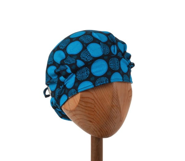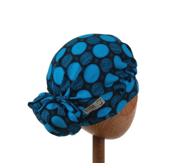 Czepek medyczny KOALA w granatowe i niebieskie japońskie wzory na czarnym tle.Czepek powstał by sprostać podstawowemu wymogowi BHP - całkowita ochrona włosów - umożliwia ubranie w formie luźnej oraz upiętej (patrz zdjęcia) - tył wykończony gumką - posiada dodatkowe, boczne tasiemki umożliwiające zawiązanie w wybraną formę.