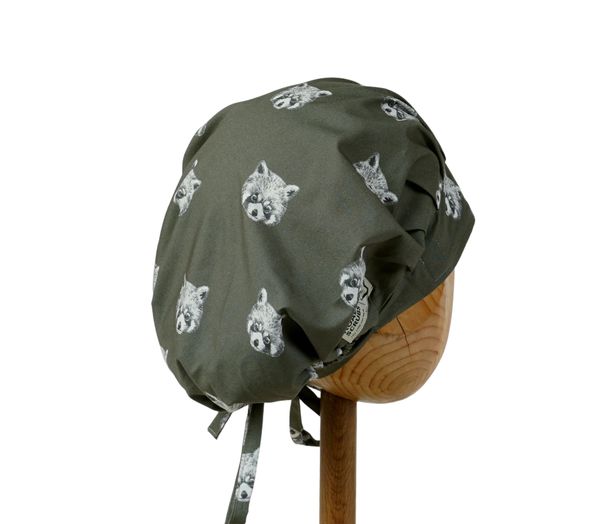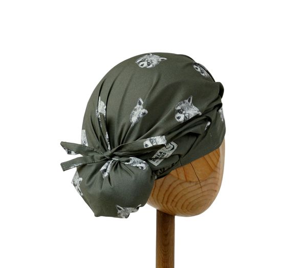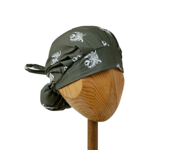Czepek medyczny KOALA w szopy na oliwkowym tle. Czepek powstał by sprostać podstawowemu wymogowi BHP - całkowita ochrona włosów - umożliwia ubranie w formie luźnej oraz upiętej (patrz zdjęcia) - tył wykończony gumką - posiada dodatkowe, boczne tasiemki umożliwiające zawiązanie w wybraną formę.