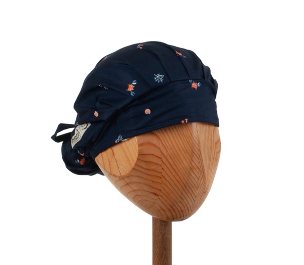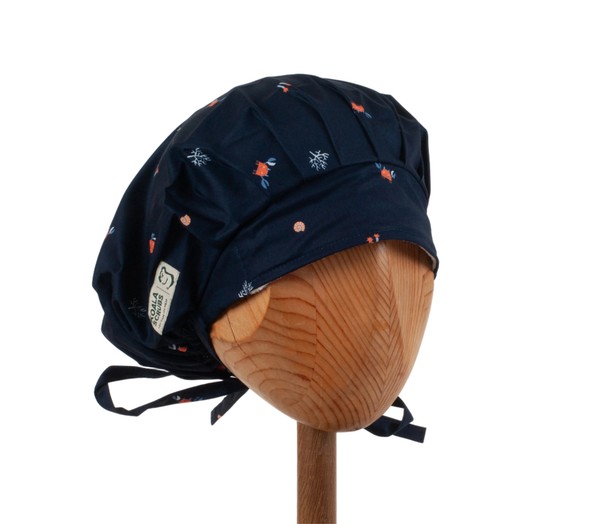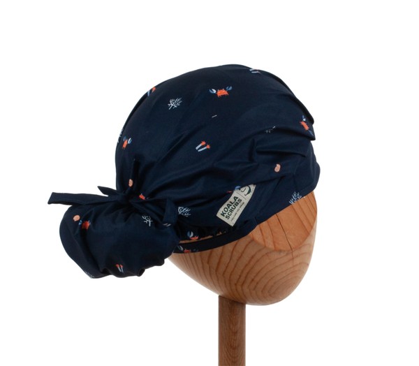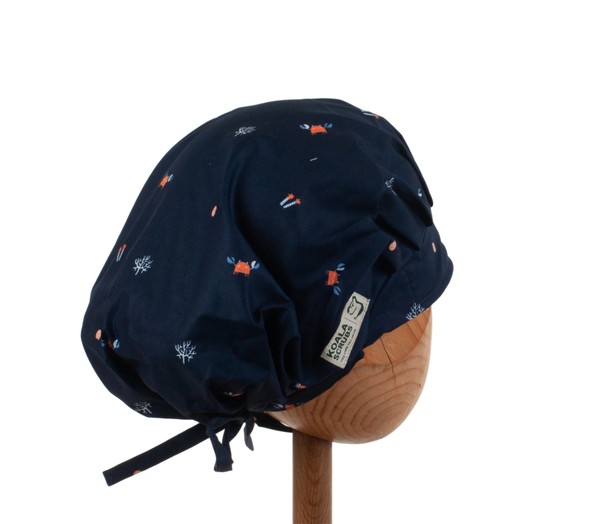 Czepek medyczny KOALA w kraby na granatowym tle. Czepek powstał by sprostać podstawowemu wymogowi BHP - całkowita ochrona włosów - umożliwia ubranie w formie luźnej oraz upiętej (patrz zdjęcia) - tył wykończony gumką - posiada dodatkowe, boczne tasiemki umożliwiające zawiązanie w wybraną formę.