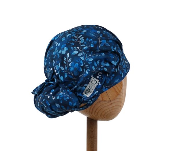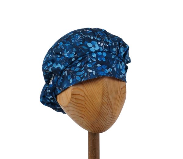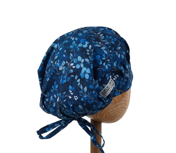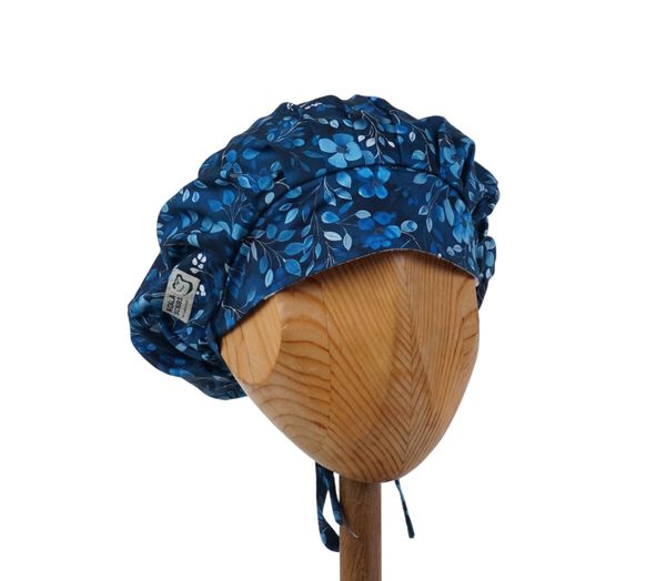 Czepek medyczny KOALA drobne niebieskawe listki na granatowym tle. Czepek powstał by sprostać podstawowemu wymogowi BHP - całkowita ochrona włosów - umożliwia ubranie w formie luźnej oraz upiętej (patrz zdjęcia) - tył wykończony gumką - posiada dodatkowe, boczne tasiemki umożliwiające zawiązanie w wybraną formę.