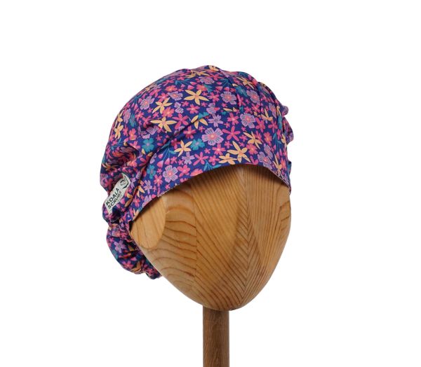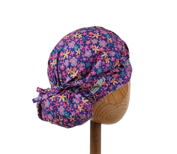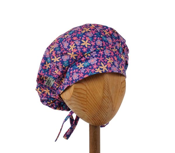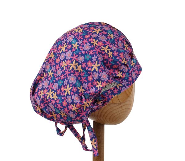 Czepek medyczny KOALA w drobne żółte, różowe, fioletowe kwiatki na granatowym tle. Czepek powstał by sprostać podstawowemu wymogowi BHP - całkowita ochrona włosów - umożliwia ubranie w formie luźnej oraz upiętej (patrz zdjęcia) - tył wykończony gumką - posiada dodatkowe, boczne tasiemki umożliwiające zawiązanie w wybraną formę.