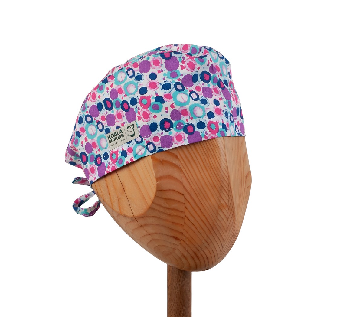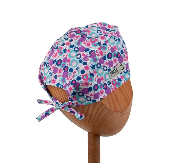 Kolorowy czepek medyczny "light" w kolorowe plamki na białym tle. Lekka konstrukcja czepka; otwarte wykończenie tyłu; brzeg dolny to podwinięta tkanina na wysokość ok.2,5cm; troczki tylne z tej samej tkaniny.