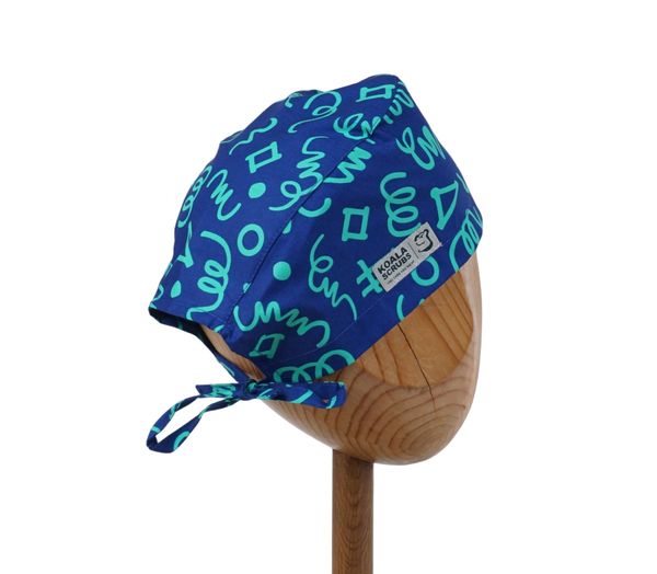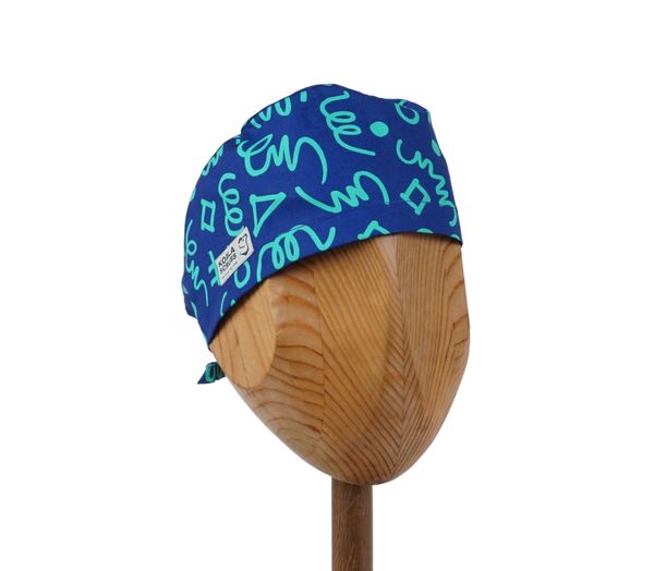 Kolorowy czepek medyczny "light" w zielone wzorki na granatowym tle. Lekka konstrukcja czepka; otwarte wykończenie tyłu; brzeg dolny to podwinięta tkanina na wysokość ok.2,5cm; troczki tylne z tej samej tkaniny.
