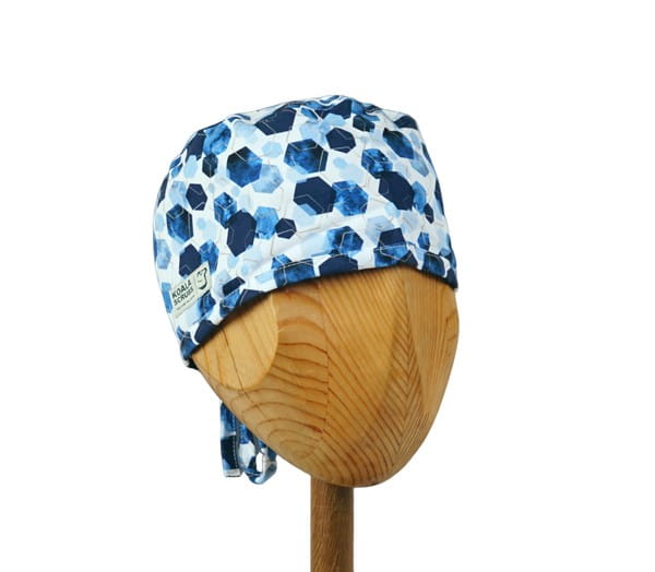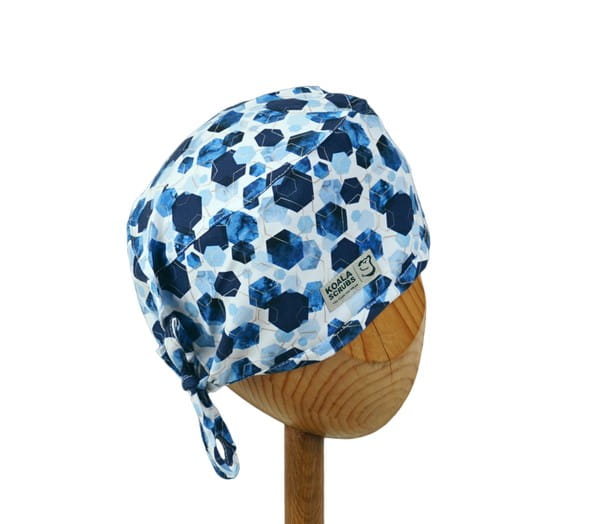 Kolorowy czepek medyczny uniwersalny w granatowe i niebieskie sześciokątne kafelki na białym tle.Regularna i wygodna konstrukcja; wykończenie tyłu umożliwia zarówno wypuszczenie dłuższych włosów na zewnątrz jak i ich upięcie pod czepkiem; brzeg dolny wykończony lamówką z tej samej tkaniny.