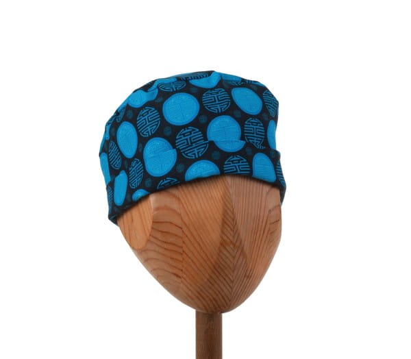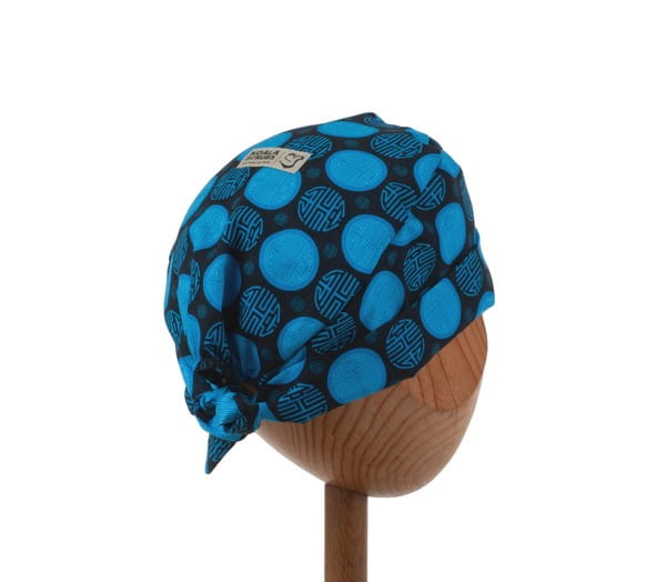 Czepek medyczny wywijany w granatowe i niebieskie japońskie wzory na czarnym tle.Konstrukcja czepka dająca wiele możliwości; czoło, boki oraz troczki to jedna podwójnie złożona tkanina - umożliwia noszenie zarówno w formie niewywiniętej jak również pełną regulację głębokości poprzez wywinięcie brzegu dolnego: tył otwarty, wykończony gumką.